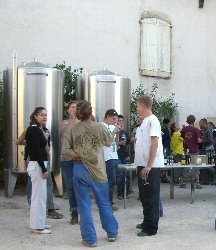 | 収穫から帰って醸造所の庭で…… | ラピエール夫妻や収穫を手伝う皆さんと食事…… |